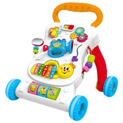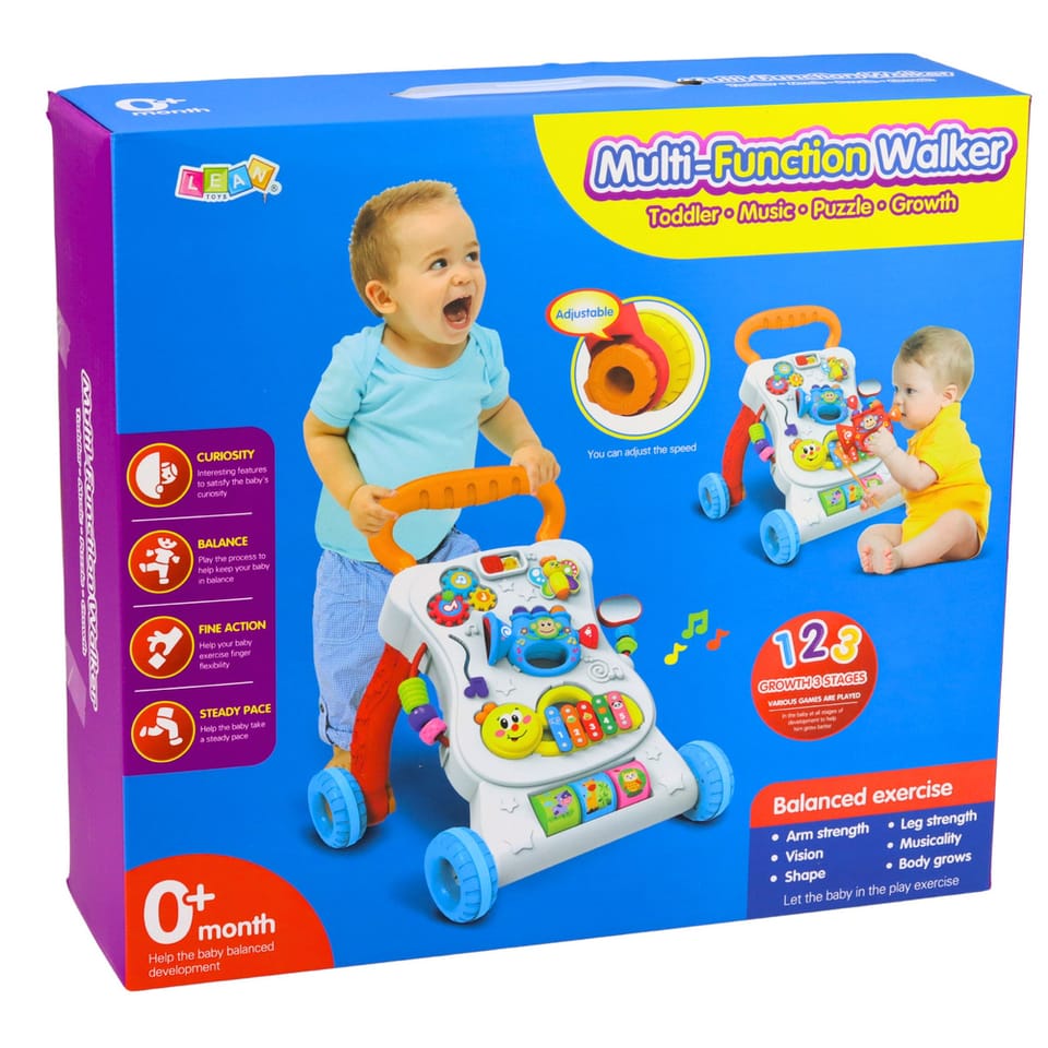 Chodzik łączy w sobie aż trzy funkcje: naukę chodzenia, zabawę na siedząco oraz aktywności manualne. Wyposażony jest w kolorowy panel z elementami muzycznymi, przyciskami, ruchomymi częściami oraz prostymi układankami, które rozwijają zdolności poznawcze i motoryczne. Dodatkowym atutem jest możliwość regulacji prędkości kół, co pozwala dopasować produkt do etapu rozwoju dziecka.