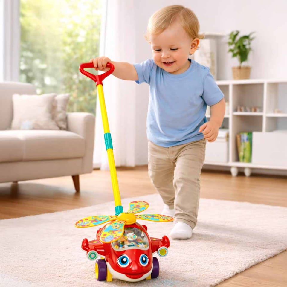 Poprzez zabawę z pchaczem dziecko poprawi swoje zdolności motoryczne. Przede wszystkim poćwiczy techniki chodzenia, a także koordynację wzrokowo-ruchową. Dla niewprawionego pilota jednoczesne spacerowanie i pchanie samolociku może wcale nie być takie łatwe!