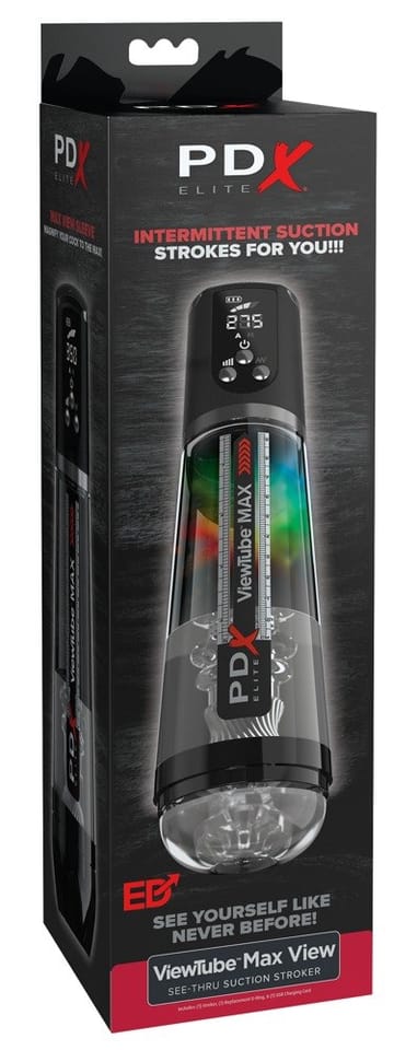 MAXymalna przyjemność z obciągania - w pełni automatyczna!Przezroczysty masturbator ViewTube MAX od PDX Elite w poręcznej przezroczystej obudowie z ochronną nasadką. Najlepszy widok na penisa, gdy migocze kolorowymi światełkami podczas przyjemności (i nabrzmiewania)! Intensywne wibracje i potężna funkcja przerywanego ssania rozpieszczają penisa na całej długości. Wibracjami i 4 automatycznie zmieniającymi się trybami ssania można sterować oddzielnie za pomocą jednego przycisku na podświetlanym diodami LED panelu sterowania. Siła ssania może być również regulowana ręcznie i jest łatwa do kontrolowania na wyświetlaczu LED. Penis jest również intensywnie masowany przez żebra i wypustki w ultra miękkim przezroczystym rękawie. Rękaw ma neutralny wygląd i można go zdjąć w celu łatwego czyszczenia.Możliwość ładowania - kabel USB do ładowania w zestawie.Całkowita długość 30,5 cm, głębokość wsunięcia 20,3 cm, O zewnętrzna 8,4 cm, O wewnętrzna wąska i rozciągliwa.Waga 640 g.ABS, TPE, PC.