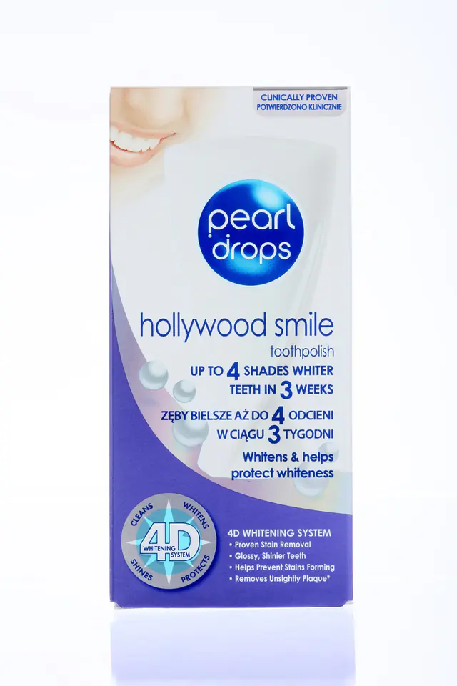 Pearl Drops Hollywood Smile zawiera zaawansowane cząsteczki polerujące i utleniające, które uwalniają aktywny tlen, dzięki czemu usuwają osad i przebarwienia ze szkliwa zębów. Pasta zawiera również fluor, który chroni zęby przed próchnicą. Badania kliniczne pokazały, że stosowana dwa razy dziennie przez trzy tygodnie wybiela zęby, aż o dwa odcienie! Można to łatwo sprawdzić na próbniku bieli, który jest dołączony do opakowania. A po trzech tygodniach oczarować znajomych piękniejszym uśmiechem.