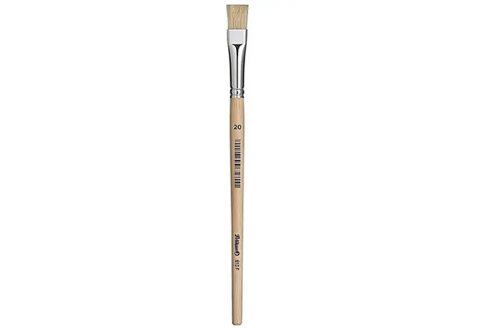 Pędzelek 613 F z krótką skuwką i prawdziwą świńską szczeciną. Włosie pędzelka jest połączone bezszwowo z drewnianym tępo zakończonym trzonkiem w naturalnym kolorze za pomocą aluminiowej skuwki.