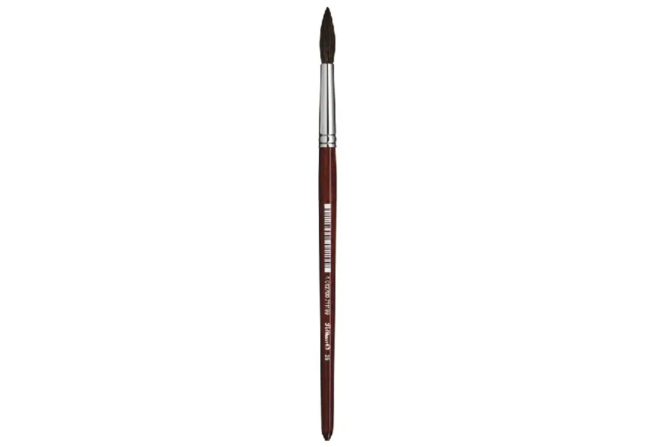 Wysokiej jakości szkolny pędzelek z cienkiego włosia 25 wykonany z włosia kuca, z trzonkiem w orzechowym kolorze. Włosie pędzelka jest połączone bezszwowo z trzonkiem aluminiową skuwką.