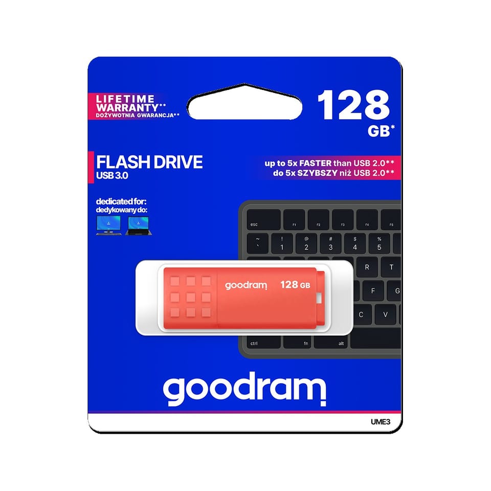 UME3 to klasyczny design, przełamany intensywnością kolorów obudowy. Zatyczka z wypukłym antypośligowym wzorem ułatwia otwarcie USB w każdej sytuacji. Po zdjęciu zatyczki można ją nałożyć na drugi koniec obudowy – daje to pewność, że się nie zgubi. Idealnym rozwiązanie dla tych, którzy lubią mieć pamięci USB zawsze przy sobie, jest perforacja umożliwiająca przypięcie zawieszki.Pamięć UME3 dostępna jest w pojemnościach od 16 GB do 128 GB. Użyte komponenty pozwalają uzyskać prędkości odczytu do 60 MB/s i zapisu do 20 MB/s. Podobnie jak wszystkie inne pamięci USB marki GOODRAM, UME3 objęty jest dożywotnią gwarancją producenta.