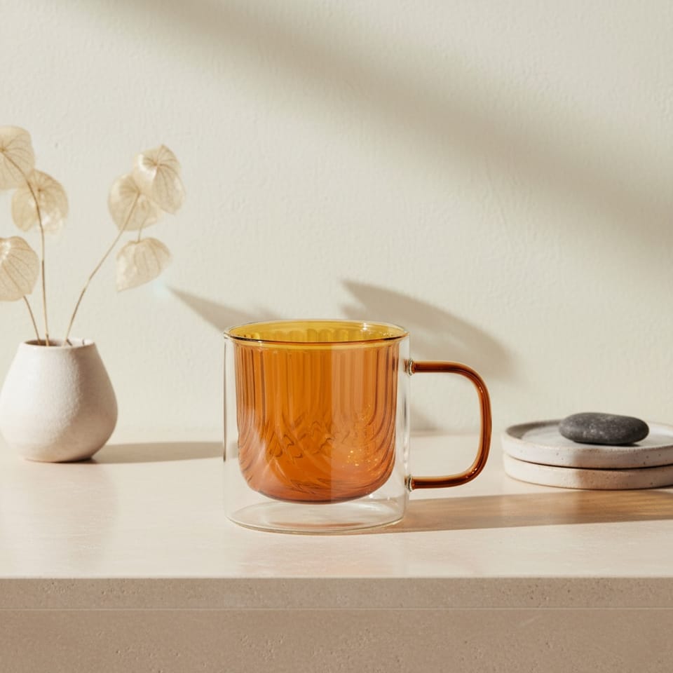 Kubek PETER HONEY o pojemności 320 ml i wymiarach 9 13 9 cm został wykonany z trwałego szkła borokrzemowego i posiada podwójne ścianki, które pomagają dłużej utrzymać temperaturę napoju. Wnętrze kubka utrzymane jest w pięknym, miodowym kolorze z subtelną fakturą, natomiast zewnętrzna warstwa szkła pozostaje bezbarwna, co tworzy ciekawy i nowoczesny efekt wizualny. Kubek wyposażono w duże, wygodne ucho, ułatwiające codzienne użytkowanie. Ze względu na delikatność materiału, zaleca się unikanie mycia w zmywarce.