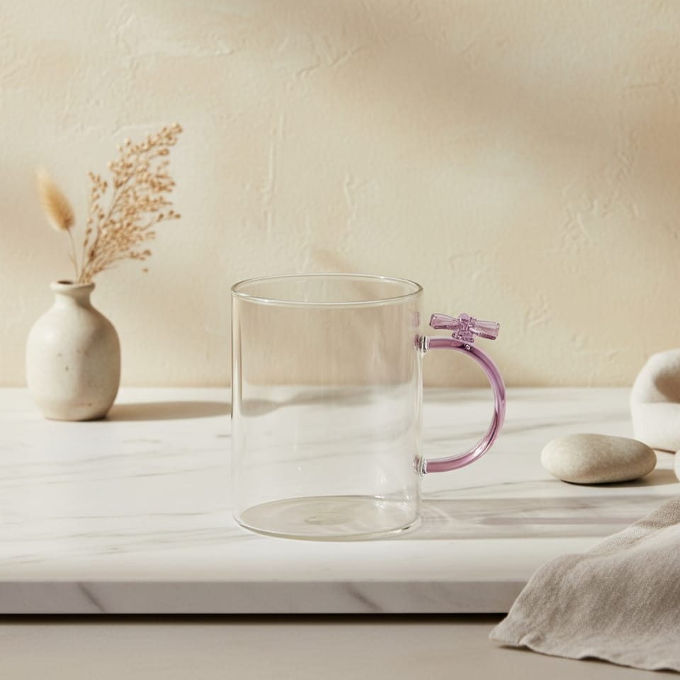 Kubek PETER RIBBON. 400 mlWymiary: 8 11,5 10 cmMateriał: szkło borokrzemoweElegancki kubek wykonany z wysokiej jakości szkła borokrzemowego, które charakteryzuje się lekkością i odpornością na zmiany temperatury. Kubek wyróżnia się subtelnym, różowym uchem, ozdobionym uroczą, słodką wstążką, co nadaje mu wyjątkowego charakteru i sprawia, że świetnie sprawdzi się zarówno na prezent, jak i do codziennego użytku.Szczegóły:Pojemność: 400 mlUcho w kolorze różowym z dekoracyjną wstążkąStylowy i oryginalny designWażne informacje:Nie należy myć w zmywarce. Zaleca się mycie ręczne. Idealny do kawy, herbaty czy innych napojów.