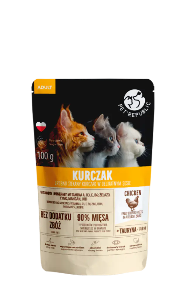 Drobno siekane kawałki kurczaka dla kotów wszystkich ras, serwowane w delikatnym sosie stanowiącym zaproszenie do pysznego posiłku. 90% mięsa i produktów pochodzenia zwierzęcego w kawałku!