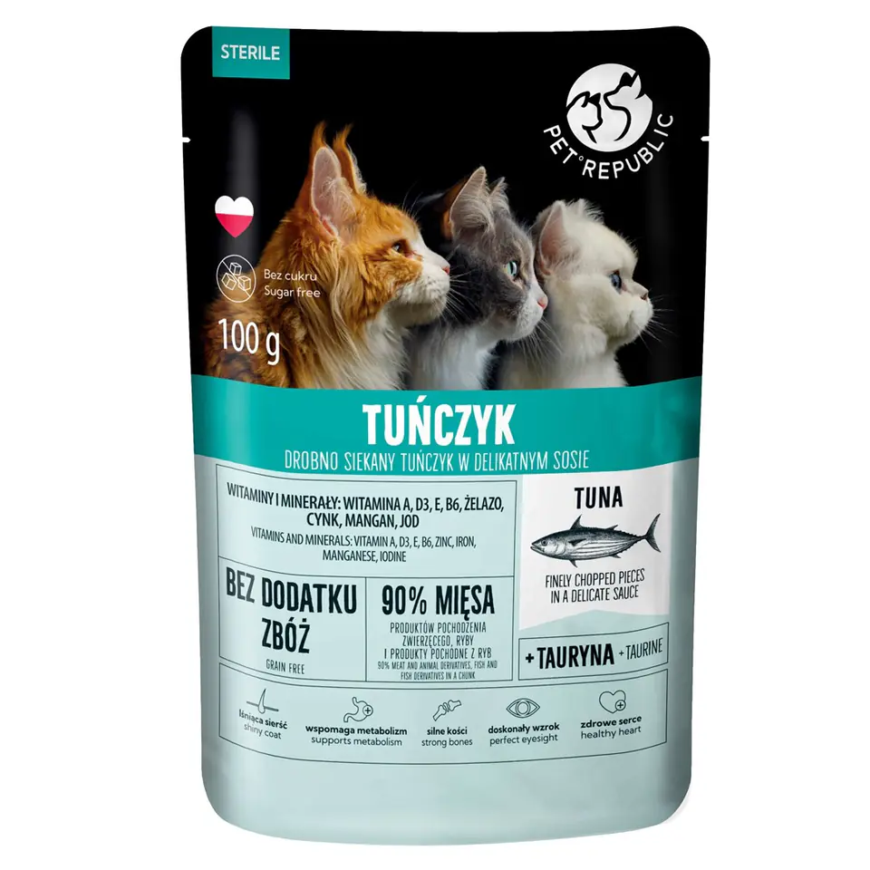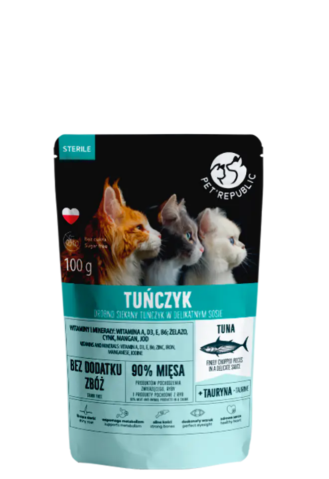 Drobno siekane kawałki tuńczyka dla kotów wszystkich ras, serwowane w delikatnym sosie stanowiącym zaproszenie do pysznego posiłku. 90% mięsa i produktów pochodzenia zwierzęcego w kawałku!