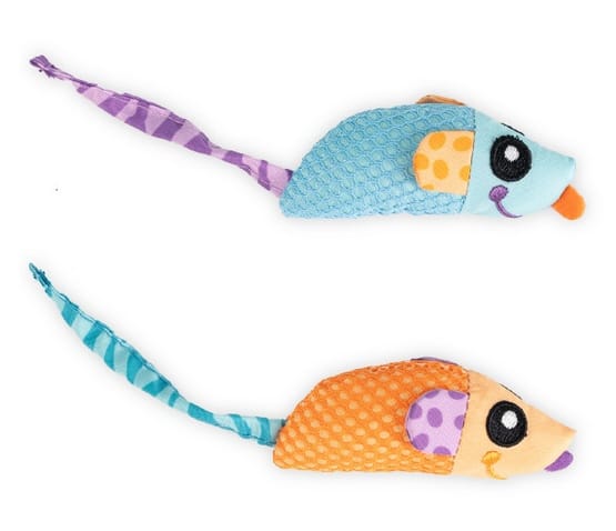 Nawet najmłodsze kociaki odczuwają naturalną chęć do chrupania i gryzienia. Myszki bliźniaczki wypełnione miękką gumą i szeleszczącą folią świetnie zaspokajają tę potrzebę.Bawełniana siateczka oczyszcza zęby.Zabawka wypełniona jest kocimiętką - naturalnym stymulatorem do nieustających kocich harców.Rybki bliźniaczki wykonane są z materiałów odpornych na kocie zęby.