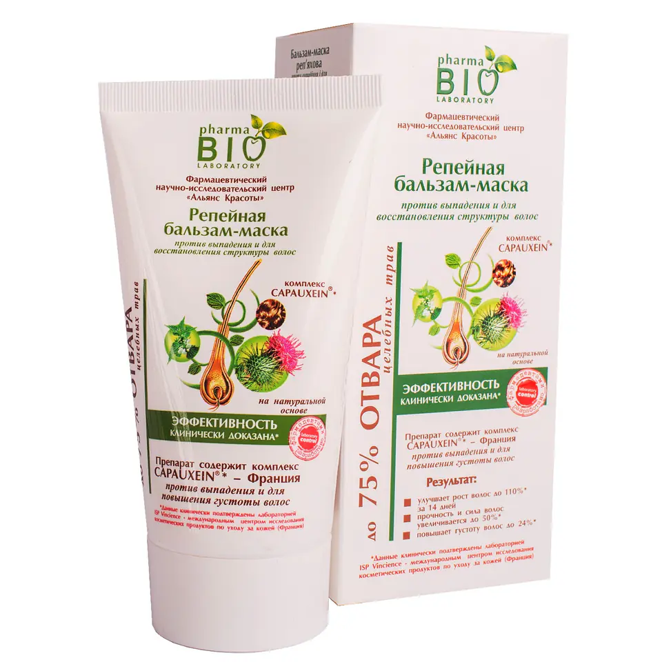 Pharma Bio Laboratory Łopianowa maska-balsam przeciw wypadaniu włosów i na przywracanie zdrowej struktury włosów 150ml (P1)4820074624102Balsam-maska łopianowa zawiera kompleks białek, które pomagają odbudować strukturę włosów na całej długości. Podstawą tego produktu nie jest zwykła woda, ale ziołowy napar #1 (korzeń łopianu duży, korzeń tataraku, pokrzywa zwyczajna, lubczyk leczniczy, biały) liść brzozy, koniczyna czerwona, szyszki chmielu) o silnym działaniu terapeutycznym dzięki kompleksowi substancji biologicznie czynnych zawartych w materiale roślinnym. Ten preparat uzupełniony francuskim kompleksem CAPAUXEIN®*, który wzmacnia łodygę włosa, zwiększając ich siłę i moc, zapobiega wypadaniu włosów i wpływa na ich wzrost i witalność poprzez zwiększenie odnowy i regeneracji komórek mieszków włosowych i zwiększyć gęstość włosów. Dzięki zastosowaniu balsamu-maski wiązanie płatków następuje na całej długości włosa, wzrasta wytrzymałość mechaniczna włosa, wilgoć zostaje zatrzymana w łodydze włosa, struktura włosa zostaje przywrócona. Dzięki temu włosy są chronione przed utratą wilgoci, wytrzymałości i elastyczność jest zwiększona na całej długości. Stają się obszerne, lśniące i gładka w dotyku. Produkt przeznaczony do włosów cienkich i zniszczonych, które łamią się, gdy czesanie. Sposób użycia: po użyciu szamponu z serii Bio Pharma równomiernie nałożyć balsam-maskę na mokro włosy na całej długości pozostawić na 2-3 minuty. Spłucz ciepłą wodą.
