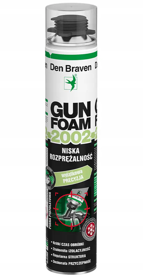 Jednoskładnikowa, poliuretanowa pistoletowa niskorozprężna Den Braven Gun Foam 2002 750ml. Znajduje zastosowanie w montażu ościeżnic okiennych, drzwiowych, bram garażowych i rolet. Wypełnianie złączy i szczelin w połączeniach między elementami przegród budowlanych. Wypełnianie prześwitów i bruzd dla rur i przewodów instalacyjnych w ścianach, stropach i dachach. Wypełnianie szczelin wokół kominów i okien dachowych. Wypełnianie szczelin między płytami styropianowymi w systemach dociepleń ścian zewnętrznych. Izolacja cieplna dachów i stropodachów. Wygłuszanie, łączenie i uszczelnianie prefabrykowanych elementów drewnianych w konstrukcjach szkieletowych. Mocowanie płyt i paneli dekoracyjnych lub izolacyjnych. Osadzanie progów, schodów, parapetów.