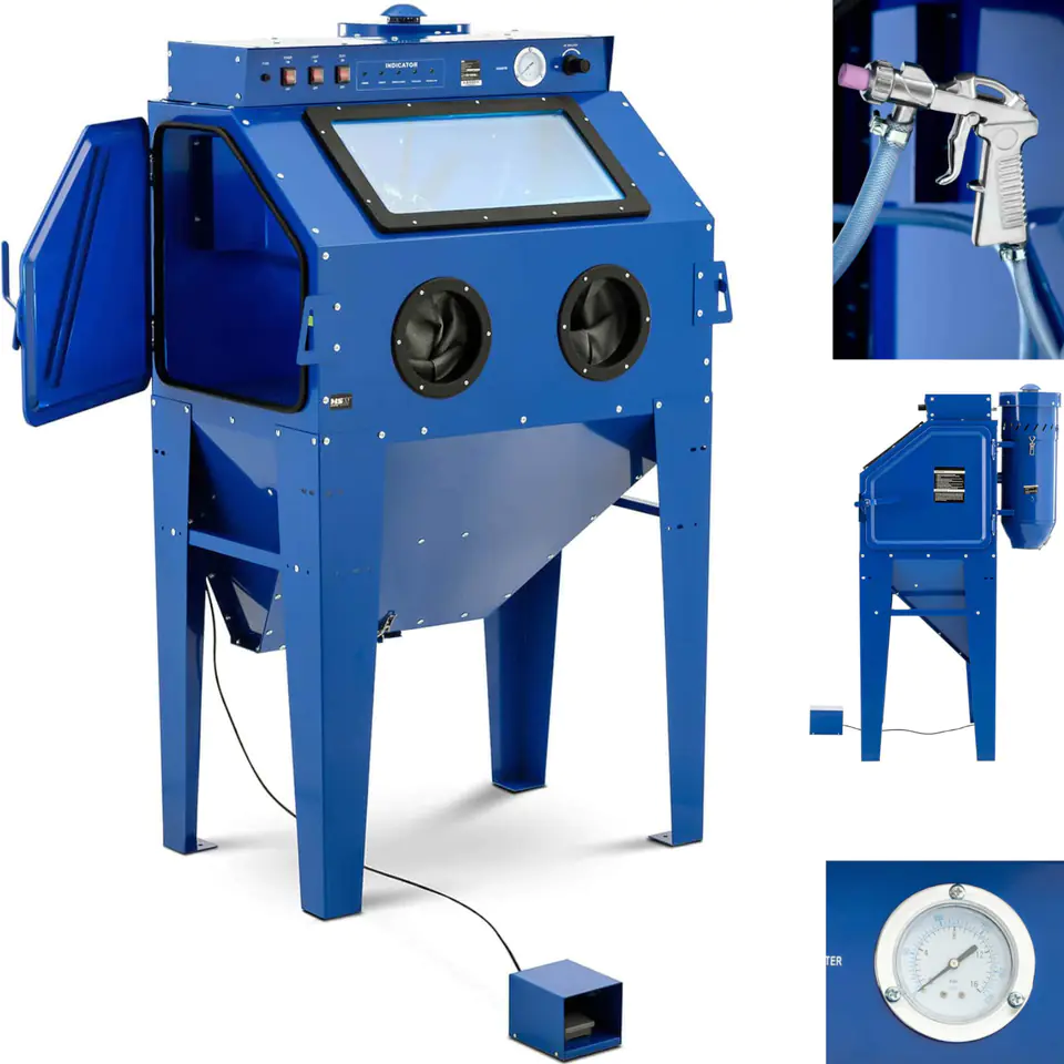 Piaskarka kabinowa marki MSW pozwala usunąć farbę, rdzę, brud z dużych elementów nie martwiąc się o kurz. Kabina ułatwia prace produkcyjne, takie jak przygotowanie czy renowację zużytych detali. Duża komora o wymiarach 92 x 59 x 92 cm oferuje dużą przestrzeń roboczą, łącznie 350 l. Regulacja ciśnienia roboczego do 125 psi lub 8,6 bara i przepływ powietrza 590 l/min pozwalają pracować wydajnie z różnymi materiałami. Pedał nożny umożliwia wygodne sterowanie przepływem powietrza. Duże okno w przedniej klapie oraz zintegrowane rękawice robocze pozwalają osiągnąć doskonałe rezultaty. Wnętrze kabiny jest oświetlane. Urządzenie wykonane zostało z wytrzymałej, powlekanej stali. Stabilne nogi i grube ściany zapewniają trwałość maszyny.