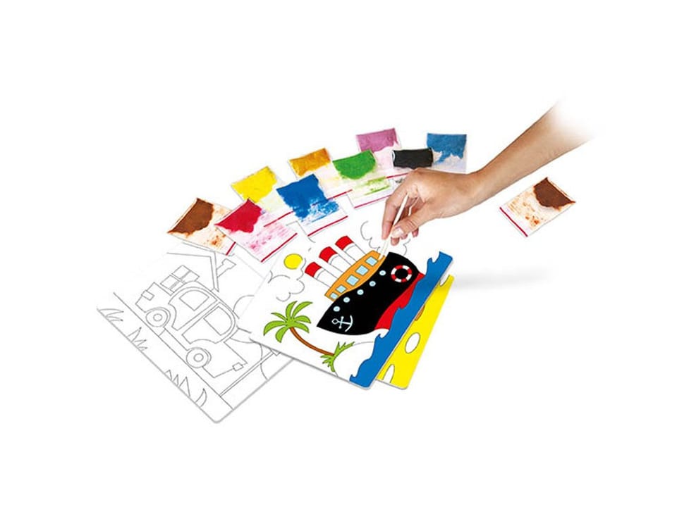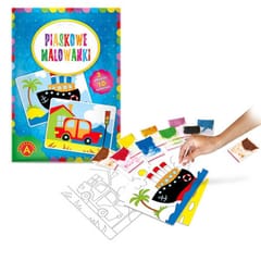 Artystyczna zabawa malowania piaskiem polegająca na odsłanianiu kolejno poszczególnych, naciętych elementów obrazka, tak by odkryć klejącą powierzchnię. Odsłonięte elementy posypuje się piaskiem w kolorze zgodnym ze wzorem tworząc piękną ilustrację. Jak wykonać obrazek?1. Przygotuj stanowisko pracy. Rozłóż na stole podkład ochronny załączony w opakowaniu.2. Za pomocą patyczka podważ wybrany element maskujący obrazka.3. Odklej podważony element tak, żeby odsłonić klejącą powierzchnię.4. Posyp piaskiem w odpowiednim kolorze odsłonięty, lepki fragment obrazka. Zalecamy rozpocząć pracę od ciemniejszych kolorów. 5. W celu równomiernego pokrycia klejącej powierzchni, rozsmaruj piasek palcami.6. Nadmiar piasku strząśnij ostrożnie na podkład.7. Strząśnięty piasek przesyp z powrotem do woreczka.8. Powtórz wybrane czynności z kolejnymi fragmentami obrazka, aż do uzupełnienia piaskami wszystkich lepkich płaszczyzn.Jak Piaskowe Malowanki stymulują rozwój dziecka?• Nawet dziecko niemające zdolności artystycznych nabiera wiary w swoje możliwości (każdemu udaje się stworzyć coś pięknego). • W trakcie zabawy dziecko doskonali swoje zdolności manualne, w tym głównie precyzję ruchów, a także zręczność i koordynację wzrokowo-ruchową. • Zabawa z Piaskowymi Malowankami pozytywnie wpływa na prawidłowy rozwój integracji sensorycznej. Co za tym idzie ma niebagatelny wpływ na powstawanie nowych połączeń między neuronami.• Rozwija kreatywności i wyobraźnię dziecka.• Ćwiczy koncentrację.• Działa relaksująco.obrazki do kolorowania – 2 szt., patyczek, woreczki kolorowego piasku – 10 szt., instrukcja.