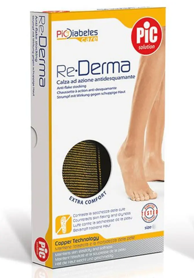Podkolanówki męskie PIC Solution dla diabetyków Stopy należą do części ciała najbardziej narażonych na powikłania cukrzycowe. Dlatego też niezwykle istotne jest, aby odpowiednio je pielęgnować i tym samym nie dopuszczać do tego, żeby zwykłe problemy z wysuszoną skórą przerodziły się w poważniejsze dolegliwości, czyli łuszczącą się skórę, co z kolei może prowadzić do powierzchownych pęknięć przyczyniających się do powstania infekcji, a nawet wrzodów.Dzięki badaniom i doświadczeniu Pic Diabetes Care, na rynku dostępna jest obecnie szeroka gama innowacyjnych rozwiązań mających na celu zapewnienie zdrowia Twoim stopom. Aby utrzymać je w dobrej kondycji, wystarczy jedynie kilka prostych czynności każdego dnia. Włókna miedzi Podkolanówki zawierające włókna miedzi, zapobiegające łuszczeniu się skóry. Copper Technology Opatentowana innowacyjna technologia "Copper Technology", wykorzystująca włókna miedzi, przeciwdziała łuszczeniu się skóry i jej przesuszaniu. Poprawia wygląd skóry poprzez zwiększanie jej elastyczności. Podkolanówki ReDerma również równoważą funkcjonowanie tkanki skórnej. Bezszwowe i oddychające Bezszwowe podkolanówki, mają właściwości oddychające i zapobiegają powstawaniu nieprzyjemnego zapachu. W opakowaniu znajduje się 1 para.Kolor: czarno-beżowy. Uwagi: Podczas prania należy unikać stosowania środków zmiękczających. Dostępne rozmiary Podkolanówki PIC Solution Re-Derma M Podkolanówki PIC Solution Re-Derma L