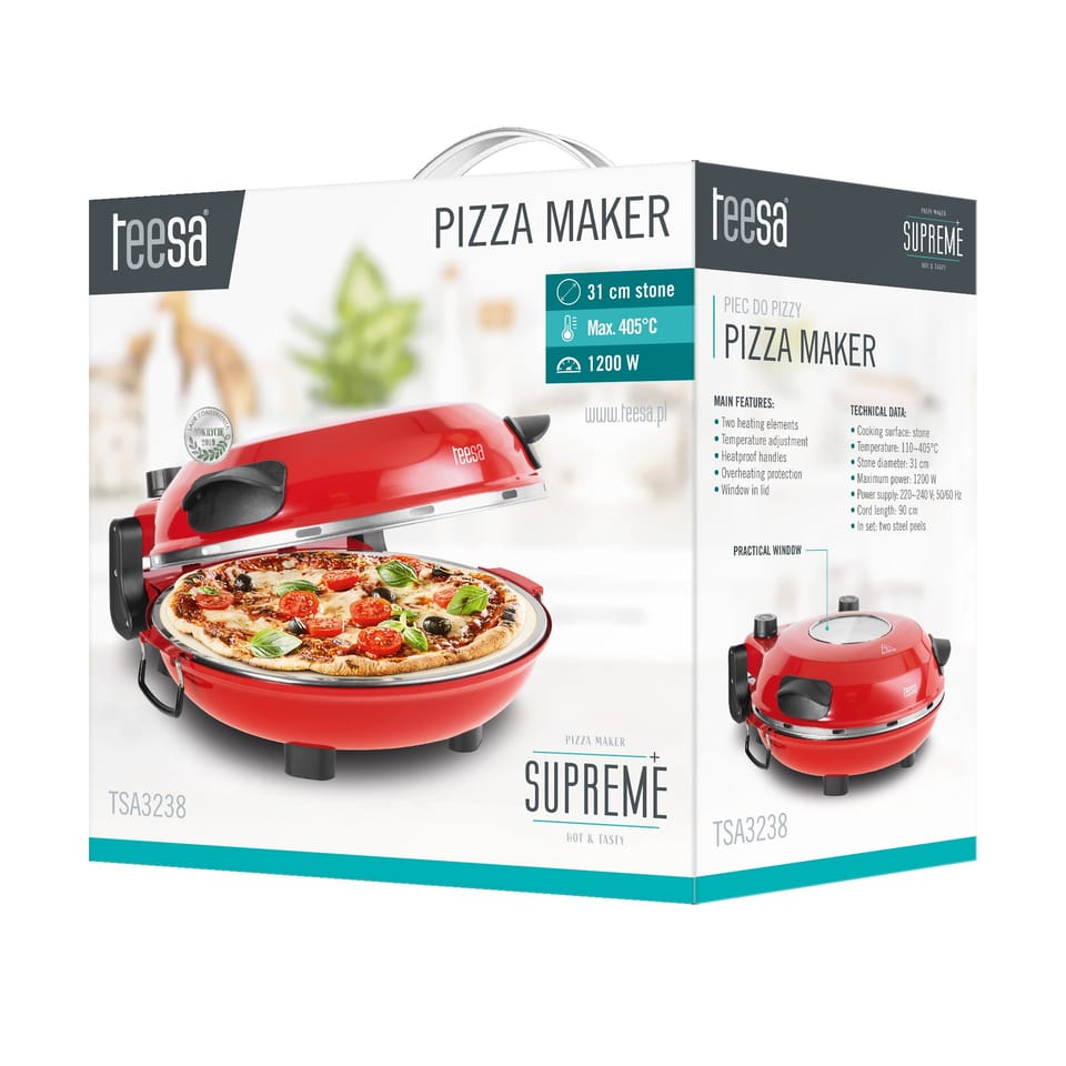 Piec do pizzy TEESA SUPREME + , 1200 W, 32 cm , okienko , wyjmowany kamień, sterowanie dwiema grzałkami