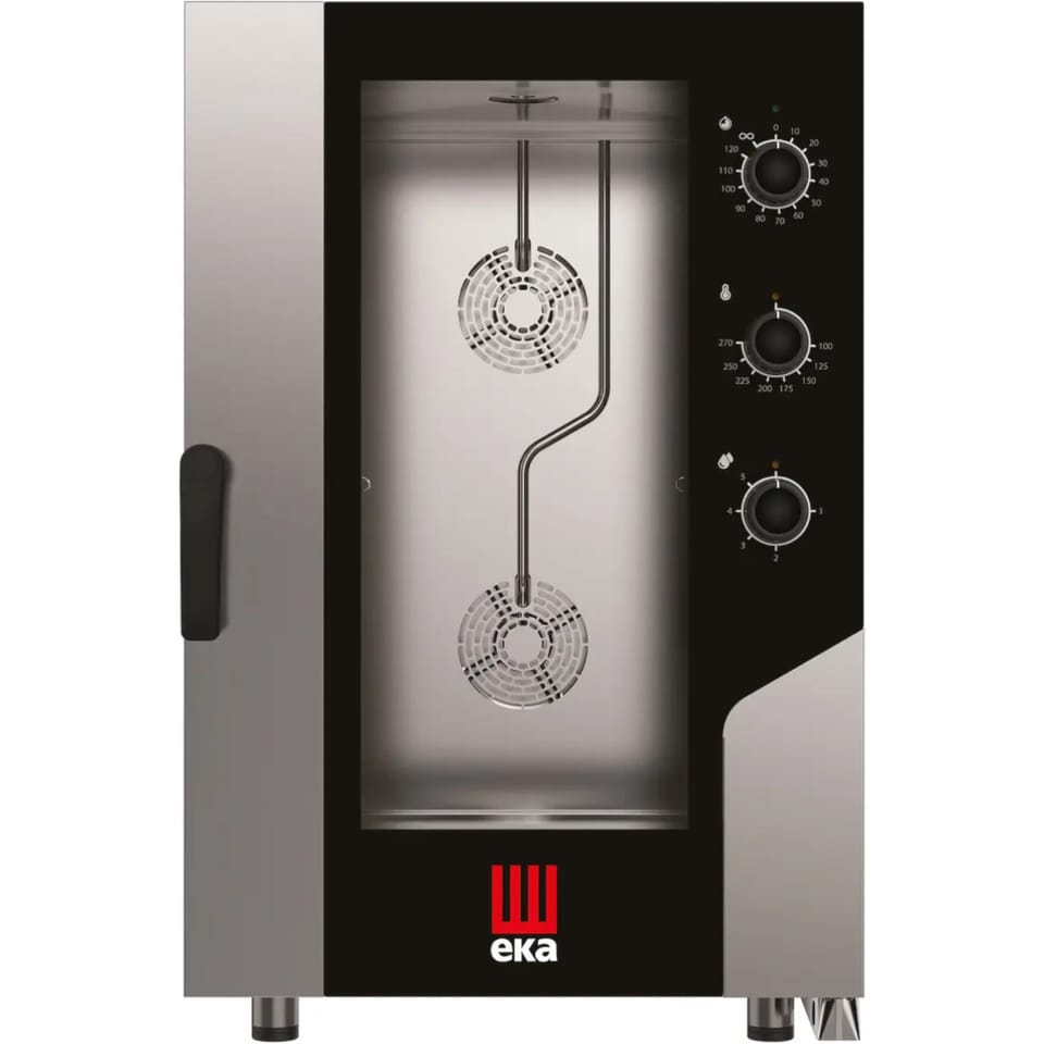 Kod producenta: MKF1111SPiec konwekcyjno-parowy Millennial Smart Gastro marki Tecnoeka to nowoczesne urządzenie kuchenne z mniejszą komorą pieczenia, szczególnie polecane dla profesjonalnej gastronomii. Piec umożliwia przygotowanie posiłków w suchym, gorącym powietrzu lub z wykorzystaniem funkcji zaparowania. Piec posiada prowadnice na 11 pojemników GN 1/1 (brak w zestawie). Obudowę wykonano w całości ze stali nierdzewnej. Funkcja zaparowania posiada 5 stopniowa regulację. Urządzenie wyposażono w skuteczną izolację, co pozwala na oszczędność energii elektrycznej. Czas regulowany jest w zakresie 10-120 min lub praca non stop. Zewnętrzna szyba pieca jest chłodzona grawitacyjnie. Piec sterowany jest elektromechanicznie za pomocą 3 pokręteł. Temperatura regulowana jest w zakresie 100-270deg;C. Piec posiada funkcję bezpieczne drzwi - blokada otwarcia przy 60deg;, 90deg;, 120deg; i 180deg; zapobiegająca oparzeniom spowodowanym przez ruch drzwi. Podwójnie przeszklone drzwi do komory oraz oświetlenie LED ułatwiają kontrole procesów w piecu. Drzwi posiadają zawias po prawej stronie. Wygodne otwieranie wewnętrznej szyby drzwi ułatwia jej czyszczenie. Uszczelka drzwi została wykonana z grubego i odpornego silikonu, jest łatwa do samodzielnej wymiany. Rynienka pod drzwiami zapobiega kapaniu skondensowanej pary. Tłoczona komora pieca ma zaokrąglone narożniki, które ułatwiają czyszczenie. Współczynnik szczelności wynosi IPX4. Regulowane nóżki umożliwiają idealne wypoziomowanie. Wymagane jest podłączenie do prądu, wody uzdatnionej, kanalizacji. Cechy produktu:
