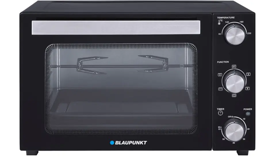 Temperaturę pieczenia w zakresie 90-230oC, można regulować za pomocą wygodnego pokrętła. Taki sam mechanizm służy również do wyboru trybu pracy urządzenia oraz ustawienia jej czasu (0-60 min), a wbudowany timer wyłączy piekarnik po upływie ustawionego czasu pracy.