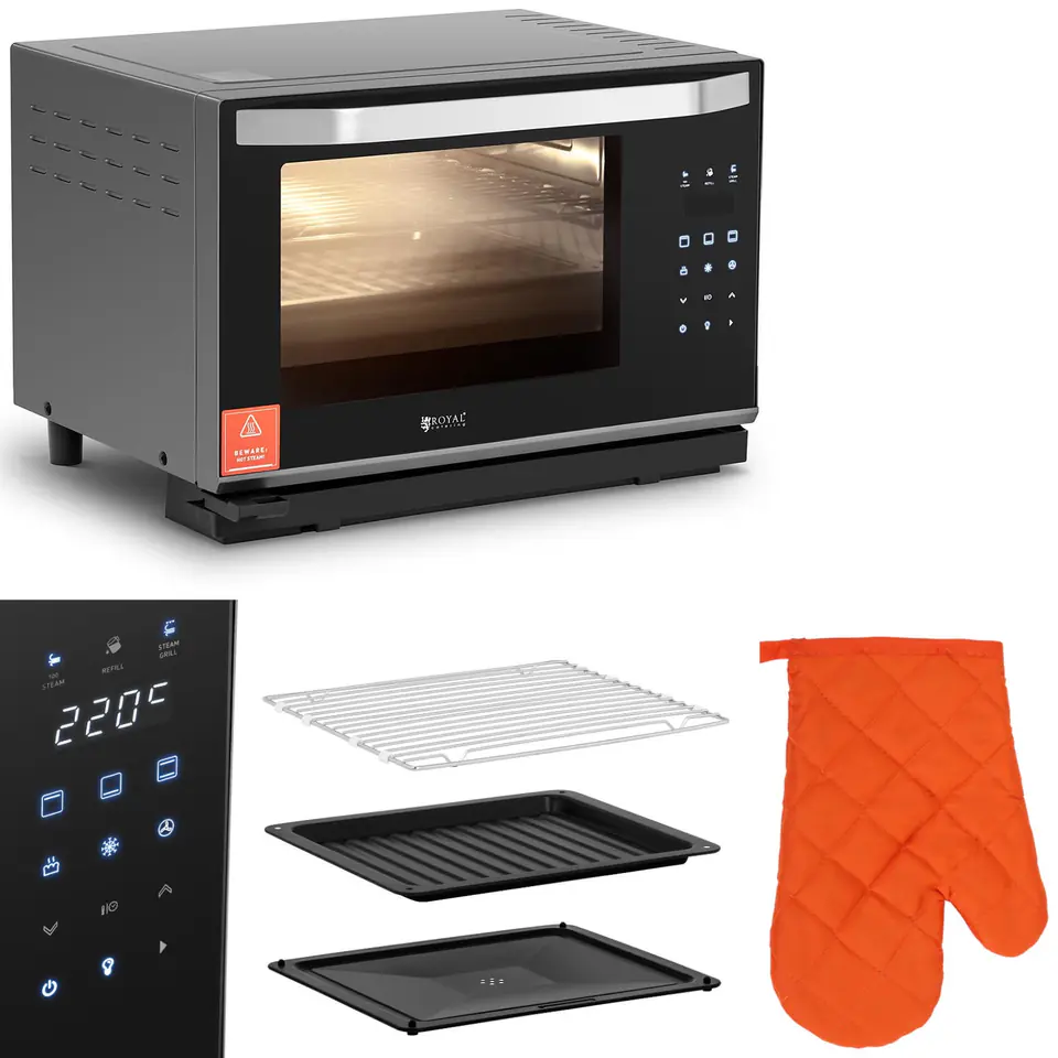 Piec konwekcyjny marki Royal Catering sprawdzi się doskonale w pizzeriach, restauracjach, bistrach, firmach cateringowych, barach itp. Pozwala uzyskać potrawy o wyjątkowych walorach smakowych. Posiada moc 2100 W, dzięki której wnętrze nagrzewa się do 220°C. Timer umożliwia ustawienie czasu pieczenia w zakresie do 180 minut. Funkcja pary gwarantuje uzyskanie pulchnego ciasta oraz kruchego, soczystego mięsa. Duży zbiornik na wodę 1,2 l wystarcza na najdłuższe programy pieczenia. Duża komora ma 3-poziomową regulację wysokości tacek (3 w zestawie). Wnętrze zostało wykonane ze stali nierdzewnej, co sprawia, że jest wyjątkowo trwałe i łatwe do wyczyszczenia. Podświetlenie zapewnia pełną kontrolę pieczenia.