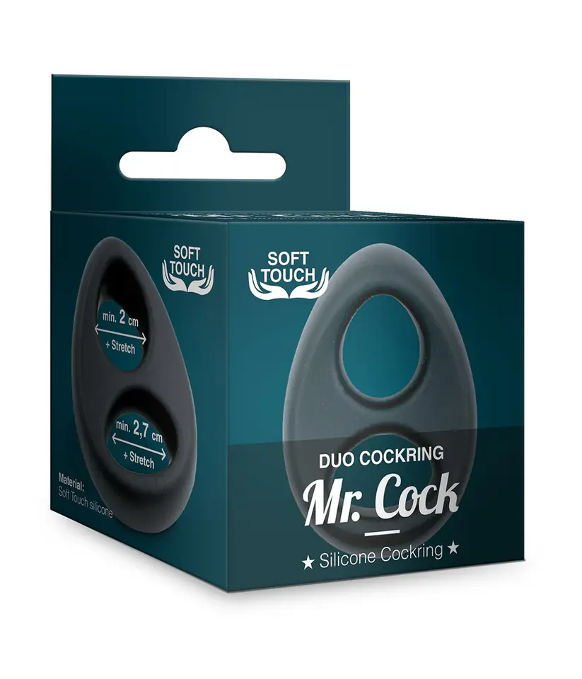 Pierścień na penisa Mr. Cock Duo- szczelnie otacza penisa i jądra, a tym samym zwiększa twardość i długość erekcji. Pierścień, który posiada zaostrzony kształt może być również używany jako stymulator łechtaczki. Uwaga: pierścień nie powinien być używany dłużej niż 20 minut. Dzięki temu unikniesz jakichkolwiek zaburzeń krążenia.Średnica pierścienia na jądra: min. około. 2,7 cm (elastyczna)Średnica pierścienia na penisa: min. około. 2 cm (elastyczna)Materiał: silikon Soft TouchKolor:czarny