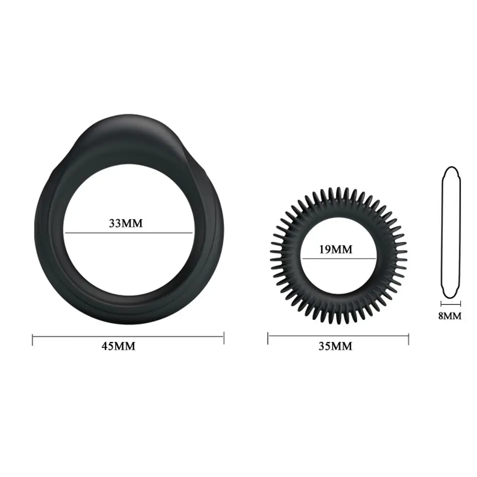Komplet dwóch pierścieni na penisa. Wodoodporne.Duży pierścień: średnica wewnętrzna 3,3cm, średnica zewnętrzna 4,5cmMały pierścień: średnica wewnętrzna 1,9cm, średnica zewnętrzna 3,5cmKolor: czarnyMateriał: silikon