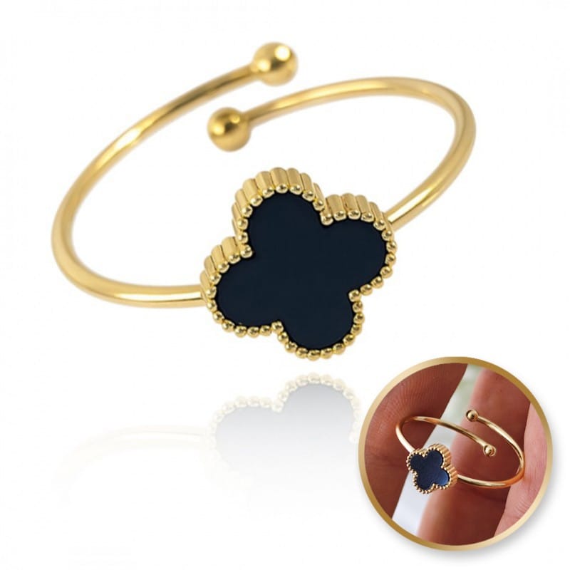 Pierścionek stal chirurgiczna platerowana złotem regulowany, czarna koniczynka PST951