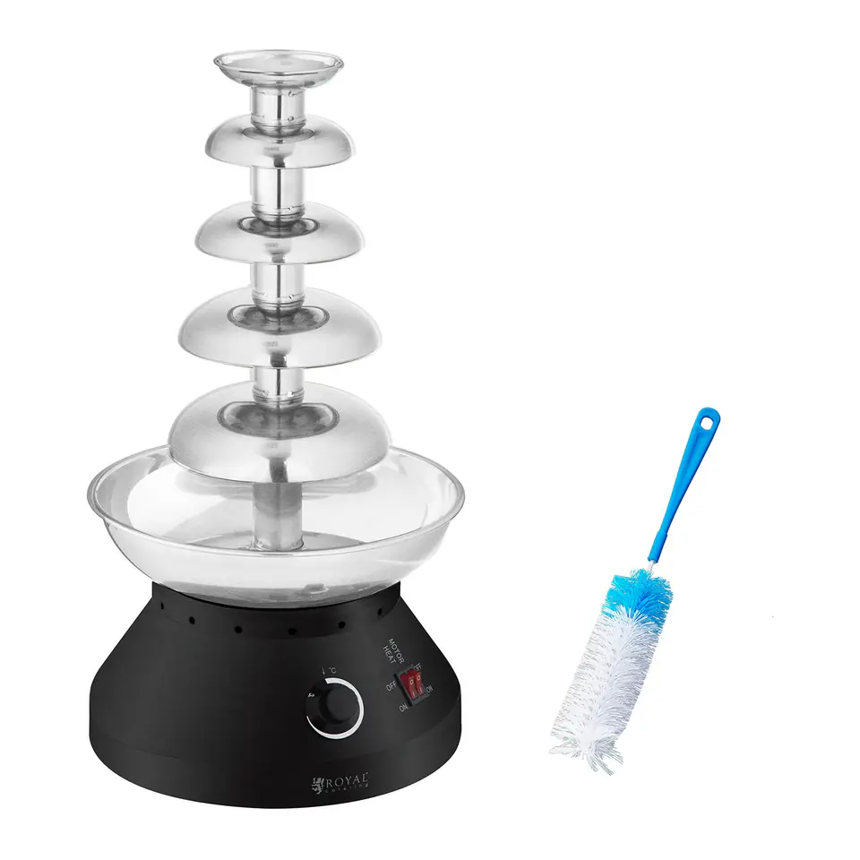 Numer producenta: Royal Catering 10010759Fontanna czekoladowa z pięcioma piętrami, dzięki wydajnemu elementowi grzewczemu (160W), skutecznie roztopi i podgrzej płynny deser. Wbudowany termostat ma za zadanie utrzymać temperaturę na odpowiednim poziomie (do 100deg;C).Całkowita pojemność urządzenia pozwala na przygotowanie do 4 kg czekolady, a konstrukcja ślimaka zapobiega powstawania zatorów. Fontanna została przystosowana do 10-12 godzin ciągłej pracy, dlatego doskonale sprawdzi się na weselach, studniówkach i innych podobnych imprezach.Misa, ślimak oraz wieża zostały wykonane z wysokiej jakości stali nierdzewnej. Jest ona odporna na uszkodzenia i korozję, a także jest łatwa w czyszczeniu. Ponadto stal nie wchodzi w reakcję z żywnością, dzięki czemu jest bezpieczna dla zdrowia. Podstawę zrobiono ze stali malowanej proszkowo, która wpływa na atrakcyjny wygląd całości.Bezpieczne użytkowanie z fontanny gwarantuje system ochrony przed przegrzaniem. Wyłącza on urządzenie w momencie, gdy osiągnie zbyt wysoką temperaturę. Dodatkowo gumowe nóżki zapobiegają ślizganiu się sprzętu po powierzchni roboczej. Cechy produktu: