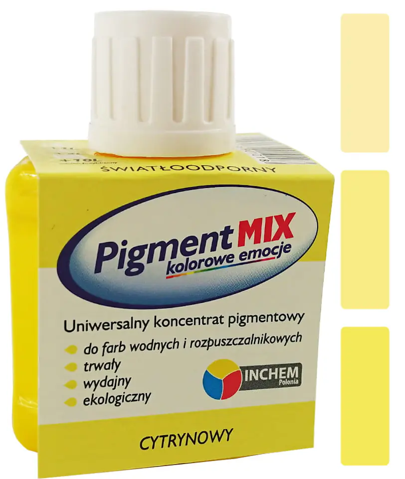 Uniwersalny koncentrat pigmentowy Inchem Pigment MIX. Nadaje się do stosowania z farbami wodnymi i rozpuszczalnikowymi. Produkt dostępny w 32 kolorach, które pozwalają na osiągnięcie praktycznie nieograniczonej ilości kolorów i odcieni, ponieważ można je ze sobą mieszać.