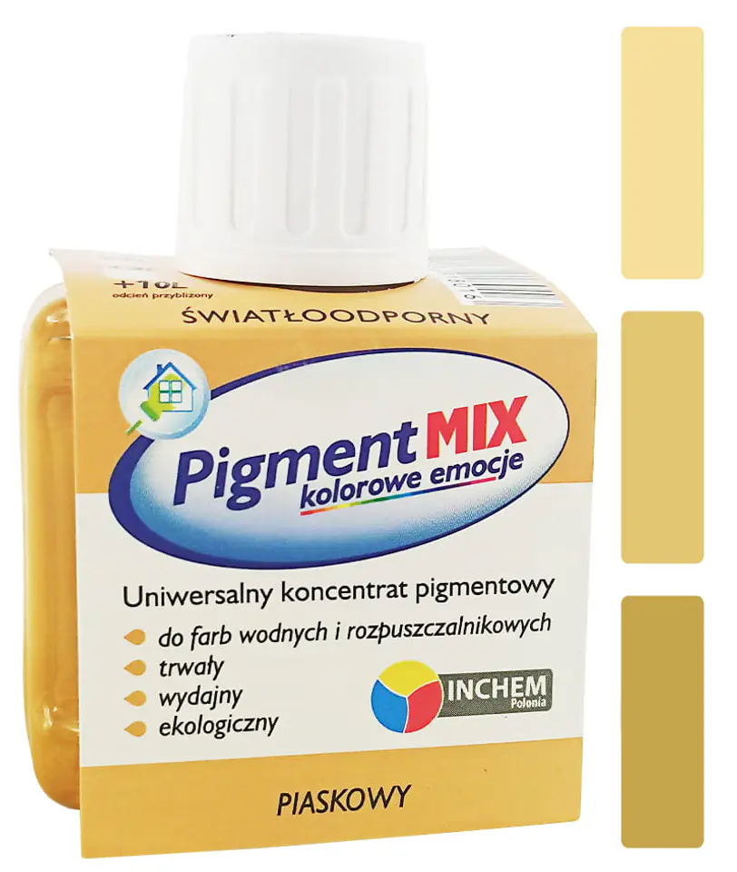 Uniwersalny koncentrat pigmentowy Inchem Pigment MIX. Nadaje się do stosowania z farbami wodnymi i rozpuszczalnikowymi. Produkt dostępny w 32 kolorach, które pozwalają na osiągnięcie praktycznie nieograniczonej ilości kolorów i odcieni, ponieważ można je ze sobą mieszać.