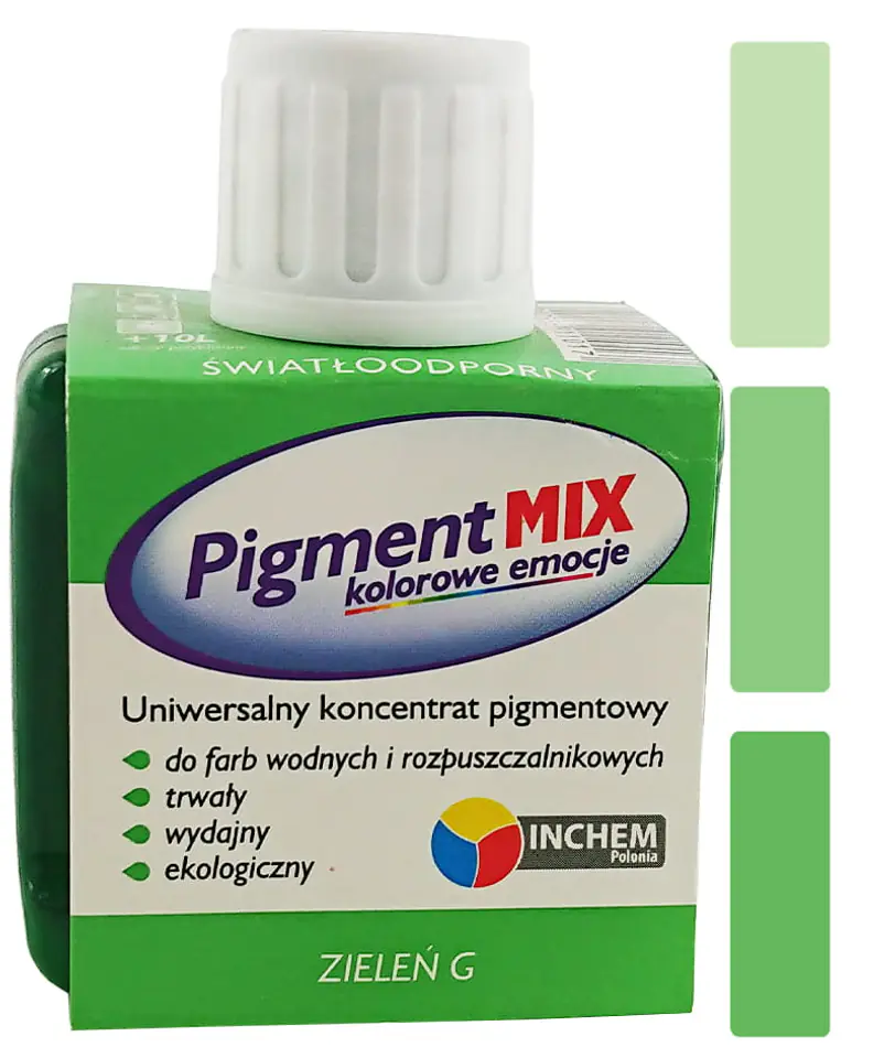 Uniwersalny koncentrat pigmentowy Inchem Pigment MIX. Nadaje się do stosowania z farbami wodnymi i rozpuszczalnikowymi. Produkt dostępny w 32 kolorach, które pozwalają na osiągnięcie praktycznie nieograniczonej ilości kolorów i odcieni, ponieważ można je ze sobą mieszać.