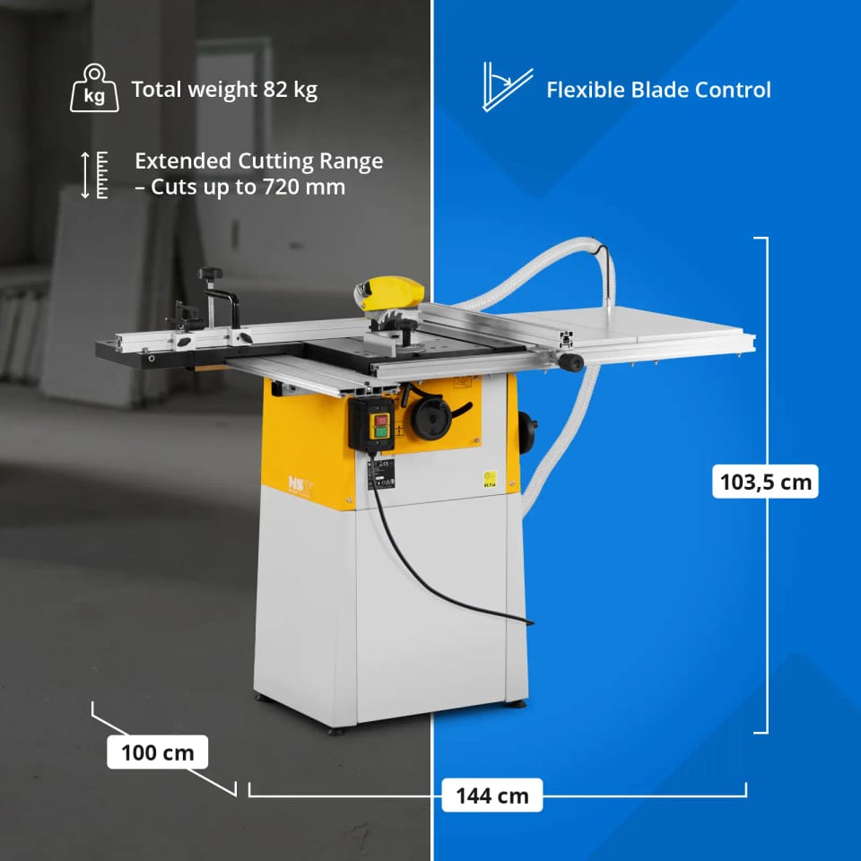 - - Piła tarczowa ze stołem przesuwnym charakteryzuje się szerokością cięcia do 720 mm przy głębokości cięcia 60 mm, więc świetnie sprawdzi się w obróbce dużych elementów,