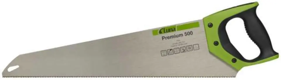 Model Premium. Uzębienie uniwersalne. Wierzchołki zębów hartowane. Brzeszczot lakierowany. Rękojeść dwukomponentowa, o krawędziach służących do odwzorowywania kątów 90° i 45° względem grzbietu brzeszczotu. Wierzchołek zbieżny, co ułatwia wprowadzanie piły w materiał.