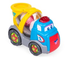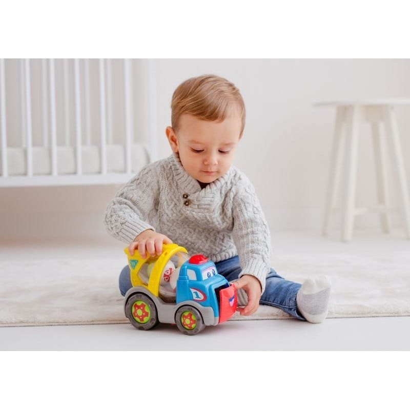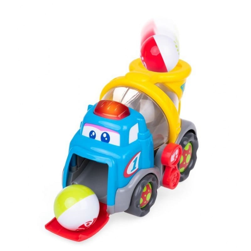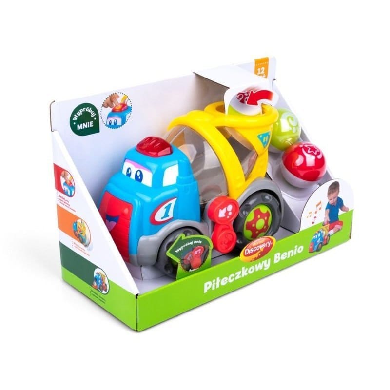 Poznaj uśmiechniętego kumpla na 4 kółkach, który śpiewa po polsku i wyrzuca piłeczki! Aby uruchomić piosenkę, naciśnij na czerwony guzik umieszczony na dachu pojazdu. Swobodny ruch kół umożliwia prowadzenie zabawki rączką. Z boku betoniarki znajduje się sprytna dźwignia. Przesuń ją w przód, aby opuścić klapę i obserwuj jak Benio wyrzuca piłeczkę! Zabawka przeznaczona dla dzieci od 12 miesiąca życia. Cechy zabawki: - zabawka śpiewa w języku polskim - z boku dźwignia do wyrzucania piłeczek - świecący przycisk na dachu - w zestawie piłeczki - wiek: od 12 miesiąca życia