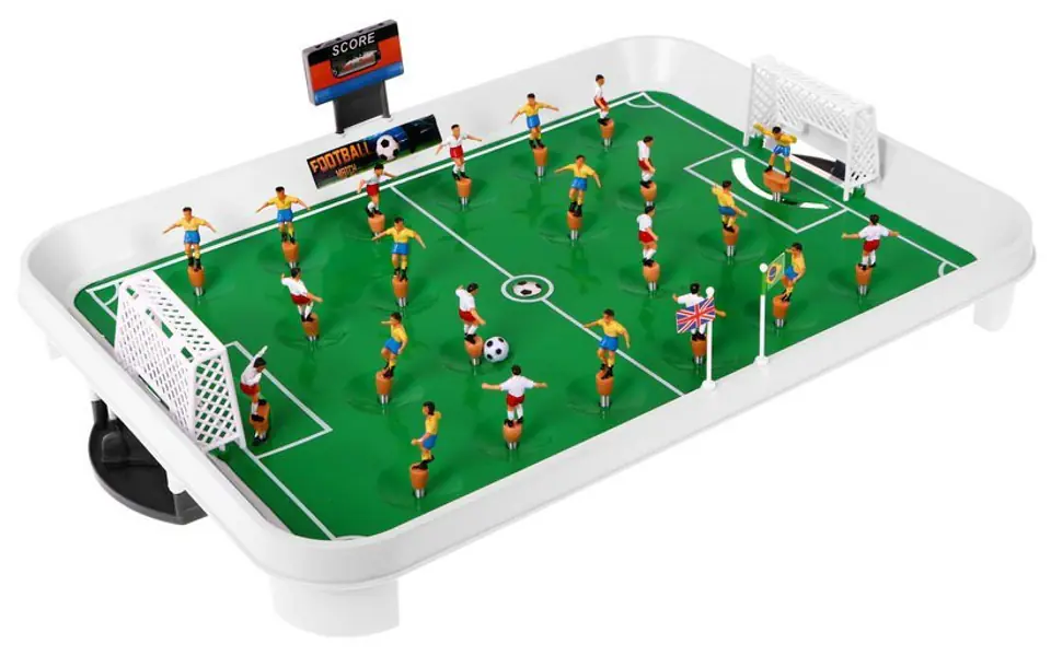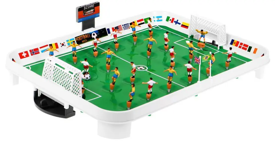 - boisko, plac gry, - piłkarzyki na sprężynkach (22 sztuki) - 2 bramki, - tablica wyników, - 1 piłeczka, - zestaw naklejek z flagami państw.