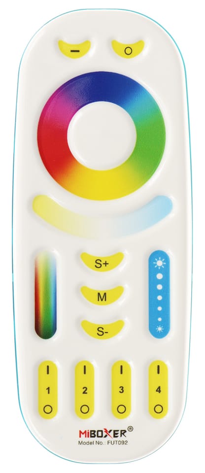Pilot FUT092 przeznaczony jest do sterowania kontrolerami oświetlenia LED serii FUT035S / FUT036S / FUT038S / FUT039S / WL5Komunikacja między urządzeniami odbywa się za pomocą fal radiowych w paśmie częstotliwości 2.4 GHzPilot wyposażony jest w dotykowe przyciski, umożliwiające niezależne sterowanie załączeniem, jasnością oraz barwą światła w maksymalnie 4 strefach