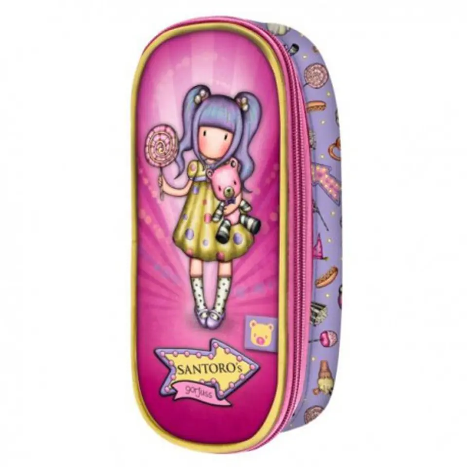 Piórnik na Suwak, Kosmetyczka - Gorjuss - First Prize Fantastyczna seria First Prize ozdobiona jest grafiką dziewczynki Gorjuss ze słodkim misiem, na tle w kolorze liliowym, wzbogacona akcesoriami z lunaparku: balonami, popcornem, lizakami, cukrową watą. Piórnik idealny na najważniejsze przybory do pisania. Wyposażony w specjalną kieszonkę z siatki na ołówki i długopisy. Może także pełnić funkcję kosmetyczki lub saszetki na niezbędne kosmetyki, przybory do szycia lub inne drobiazgi. Ozdobiony logiem Santoro na gumowanej ozdobnej strzałce. Dodatkowo zawieszka w kształcie strzałki. Wykonany ze szczególną dbałością. Posiada ciekawy wzór w stylowe paski. Wspaniały prezent, funkcjonalny dodatek do każdego tornistra. Wymiary: 23 cm x 10 cm x 6 cm. Zabawna kolekcja Fairground pełna plecaków, akcesoriów i artykułów papierniczych, która nawiązuje do tajemniczych przygód przeżytych w Wesołym Miasteczku pełna fajerwerków, karuzel, beczek śmiechu, huśtawek i zdobywanych nagród. Zabawne pompony, wzory pełne smakołyków czy metalowe zawieszki przeniosą nas do barwnego świata Santoro, pełnego niespodzianek jakie nas czekają w lunaparku. To kolekcja, którą będziemy cenić przez wiele lat. Podążaj za dziewczynami, bohaterkami 4 serii: Up & Away, Fireworks, Carusel i First Prize i odkrywaj ekscytującą kolekcję pełną cudownych smakołyków! 384GJ22