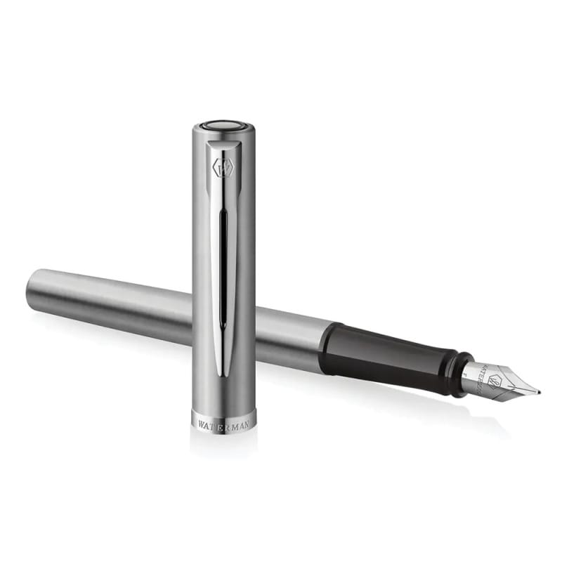 W kolekcji Impression nacisk położono na czystość formy i funkcjonalność, które mają znaczenie w codziennym pisaniu. Stalowa wersja CT jest jedną z najbardziej wyrazistych interpretacji tej idei. To pióro wieczne zaprojektowane z myślą o osobach, które cenią nowoczesny, uporządkowany styl oraz narzędzia dobrze dopasowane do rytmu pracy. W tej odsłonie marka Waterman stawia na minimalizm, precyzję i spójną estetykę.Korpus i skuwka wykonane zostały ze stali o subtelnym, szczotkowanym wykończeniu. Powierzchnia nie jest lakierowana, dzięki czemu zachowuje naturalny, metaliczny charakter i delikatny, matowy połysk. Całość prezentuje się jednolicie i nowocześnie, bez kontrastowych kolorów czy dekoracyjnych wzorów. Chromowane detale – klips oraz pierścień – porządkują wizualnie formę i podkreślają techniczną elegancję projektu.
