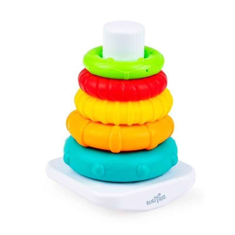 Piramidka Kolorowe Obręcze Pięć kolorowych obręczy, a każda z nich w innym rozmiarze, kolorze i z innymi wypustkami! Ułóż z nich kolorową piramidkę, budując ją od największej obręczy do najmniejszej. Pomoże w tym podstawka z drążkiem, na którą należy natykać obręcze, jedną po drugiej. Kiedy piramidka będzie gotowa, wystarczy zsunąć z niej kolorowe krążki, aby rozpocząć zabawę od nowa. Zróżnicowane faktury obręczy stymulować będą zmysł dotyku malucha, pozwalając mu przy tym rozwijać zdolności poznawcze. Cechy produktu: - w zestawie 5 obręczy różniących się rozmiarem, kolorem i wypustkami; - do układania od największej do najmniejszej; Wiek: 6m.