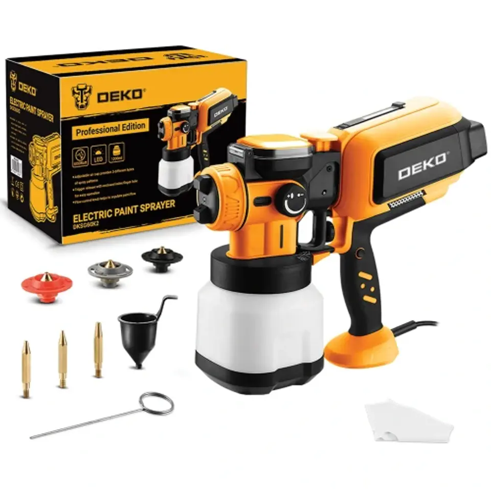 Dane techniczne: Marka: DEKO Model: DKSG60K2 Napięcie: AC 220-240 V ~50/60 Hz Moc maksymalna: 600 W Pojemność zbiornika: 1200 ml Maksymalna lepkość: 120 DIN-secs (120 sekund przelewania przez kubek Forda) Prędkość znamionowa: 38000 obr/min Rozmiary dyszy: 1.0 / 1.8 / 2.5 mm Jasność LED: 230 – 250 lm Temperatura barwy: 7200 – 8000 K Moc/prąd LED: 4 W / 200 mA Współczynnik CRI: 4 W / 200 mA Waga urządzenia: 1.8 kg Wyposażenie: 3 wymienne dysze, lejek do pomiaru lepkości, zbiornik na farbę, 3 iglice, maseczka jednorazowa, rękawiczki jednorazowe, instrukcja obsługi w języku polskim Dzięki zastosowanej technologii HVLP zaoszczędzisz czas i pieniądze Skrót HVLP oznacza High Volume Low Presure (dużą objętość i niskie ciśnienie). Technologia charakteryzuje się większą oszczędnością środków lakierniczych, nawet o 30% w porównaniu do technologii HP. Takie rozwiązanie pozwala na sporą oszczędność czasu, ponieważ malowanie natryskowe jest znacznie szybsze i wydajniejsze od metody tradycyjnej lub przy użyciu standardowych pistoletów malarskich. Pistolet malarski do zadań specjalnych! Pistolet DEKO DKSG60K2 typu HVLP zapewnia równomierne nakładanie farby na różnego rodzaju powierzchniach w łatwo i trudno dostępnych miejscach. Doskonale sprawdzi się zarówno dla profesjonalisty, jak i amatora! Pistolet DEKO użyjesz z: farbami wodorozcieńczalnymi, lakierami, podkładami, farbami wykończeniowymi, wypełniaczami, bejcami i wiele więcej! Mocny silnik z miedzianym uzwojeniem gwarantem wydajnej pracy Pistolet DEKO został wyposażony w mocny silnik, z miedzianym uzwojeniem wirnika. Taka konstrukcja jest BEZKONKURENCYJNA, w zestawieniu ze swoim aluminiowym odpowiednikiem. Posiada dłuższy czas eksploatacji – wytwarza mniej ciepła, co zmniejsza ryzyko uszkodzeń termicznych, w tym izolacji, umożliwiając dłuższą eksploatację. Mniejsze gabaryty – większa przewodność miedzi zastosowanej w wirniku oraz związana z tym mniejsza wymagana objętość stali umożliwiła zmniejszenie gabarytów silnika. Silnik z miedzianym uzwojeniem zastosowany w pistolecie DEKO posiada wyższą o 1-5% sprawność znamionową, a zatem zużywa mniej energii! Pełna kontrola pracy urządzenia podstawą efektywnej pracy Dla zwiększenia wygody użytkowania zastosowano szereg regulacji, które sprawią, że praca z urządzeniem jest łatwa, przyjemna i efektywna! Regulacja przepływu — dzięki, której ustawisz przepływ cieszy, zgodnie z aktualnie wykonywanym zadaniem. Regulacja ciśnienia — za pomocą, której dopasujesz poziom ciśnienia powietrza generowanego przez jednostkę zasilającą. Regulacja kształtu rozpylanej farby umożliwi doskonale precyzyjne malowanie Regulacja kształtu rozpylanej farby pozwala na ustawienie strumienia w 3 dowolnych pozycjach: okrągły - do malowania detali, np. punktowo pozioma elipsa - do malowania w pionie pionowa elipsa - do malowania w poziomie Dzięki szerokiej regulacji kształtu malowania w mgnieniu oka pokryjesz obszary o różnej szerokości, grubości i długości! Szereg praktycznych zastosowań, aby ułatwić Ci pracę! Światło LED umożliwi Ci doskonałą widoczność malowanej powierzchni. Dzięki odłączanej części pistoletowej od silnika, z łatwością można go wyczyścić. Urządzenie posiada górny otwór do wlewu farby. Dzięki temu nie musisz odłączać zbiornika, aby uzupełnić farbę! Długie sesje pracy zapewni pojemny zbiornik 1200 ml i specjalnie zakrzywiona rurka ssąca Pistolet został tak zaprojektowany, aby użytkownik jak najmniej czasu poświęcał na jego montaż/demontaż oraz czyszczenie. Zbiornik na farbę posiada pojemność 1200 ml, dzięki czemu możesz umieścić w nim nawet całą puszkę farby! Możesz pracować dłużej, bez konieczności ciągłego dolewania cieczy. Kubek Forda dołączony do zestawu pomoże Ci sprawdzić lepkość cieczy Lepkość farby jest kluczowym parametrem, który należy sprawdzić, aby uzyskać najlepsze rezultaty malowania. Można sprawdzić lepkość farby na opakowaniu produktu lub samodzielnie, korzystając z dołączonego do zestawu kubka Forda. Proces jest dziecinnie prosty. Należy napełnić kubek farbą i zmierzyć czas, w jakim farba opłynie z kubka. Na przykład, jeżeli farba spływa z kubka w czasie mniejszym niż 120 sekund, oznacza to lepkość 120 DIN-secs. Zachęcamy do dokładnego sprawdzenia lepkości farby przed zakupem i użyciem pistoletu malarskiego, aby zapewnić najwyższą jakość wykonania prac malarskich. Zestaw zawiera: Pistolet malarski DEKO DKSG60K2 3 wymienne dysze: 1.0 / 1.8 / 2.5 mm Lejek do pomiaru lepkości Zbiornik na farbę 1200 ml 3 iglice do dysz Maseczka jednorazowa Rękawiczki jednorazowe Klucz do iglic Instrukcja obsługi w języku polskim