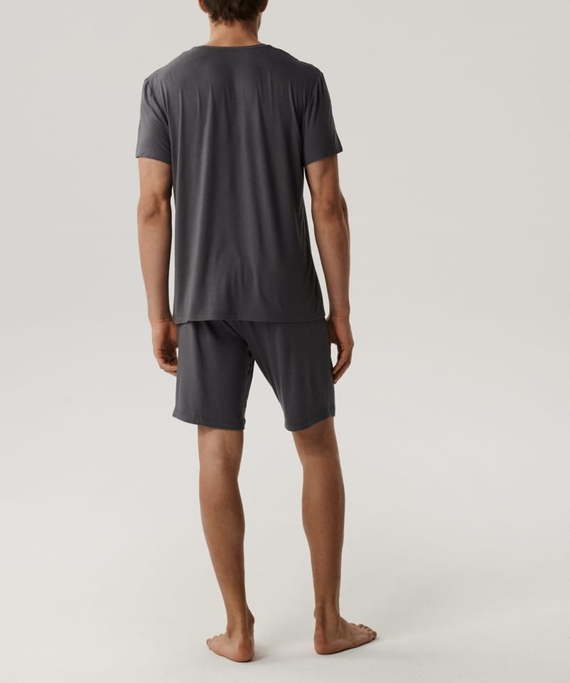 Piżama męska, która świetnie sprawdzi się także w charakterze zestawu na dzień.Koszulka z krótkimi rękawami i okrągłym dekoltem oraz krótkie spodenki. Skład: 95% wiskoza, 5% elastan.