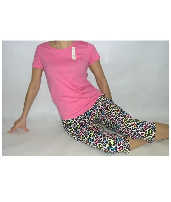 Piżama damska wykonana z wysokogatunkowej bawełny. Koszulka z krótkim rękawem, gładka. W komplecie spodnie 3/4 w kolorową panterkę.