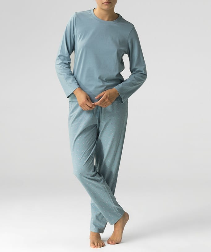 Piżama z gładką bluzką typu longsleeve delikatnie przylegającą do ciała oraz długimi, luźnymi spodniami w kokardki. Ponadto dzianina pokryta jest maleńkimi włoskami (tzw. peach effect). Skład: 100% bawełna.