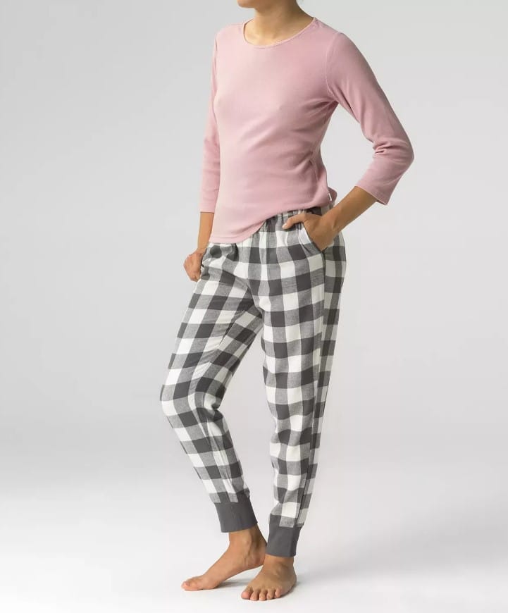 Piżama damska z gładką koszulką i kraciastymi spodniami. Maksymalny poziom wygody. Miękka dzianina i niecisnący ściągacz w talii. Praktyczne kieszenie po bokach. Skład góra: 95% bawełna, 5% elastan, dół: 100% bawełna.