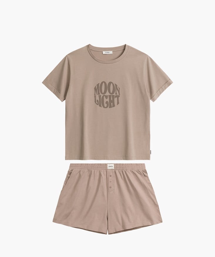 Piżama na wiosenno-letnie noce wykonana z miękkiej i przyjemnej w dotyku bawełny. Koszulka z krótkim, podwiniętym rękawem, okrągłym dekoltem oraz napisem Moonlight. Do kompletu szorty z kieszeniami po bokach. Skład: 100% bawełna.