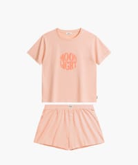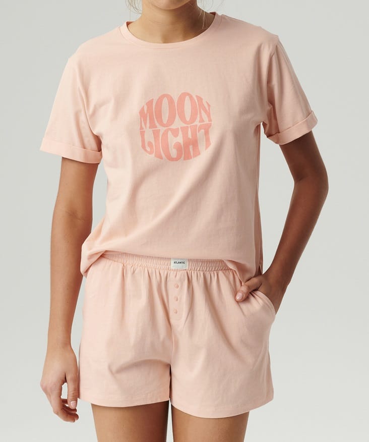 Piżama na wiosenno-letnie noce wykonana z miękkiej i przyjemnej w dotyku bawełny. Koszulka z krótkim, podwiniętym rękawem, okrągłym dekoltem oraz napisem Moonlight. Do kompletu szorty z kieszeniami po bokach. Skład: 100% bawełna.