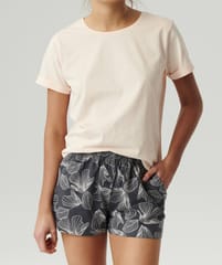 Piżama na wiosenno-letnie noce wykonana z miękkiej i przyjemnej w dotyku bawełny. Koszulka gładka z krótkim, podwiniętym rękawem i okrągłym dekoltem. Szorty z kwiatowym nadrukiem, kieszeniami po bokach, wykończone w talii szeroką gumą. Skład:100% bawełna.