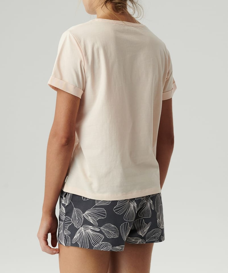 Piżama na wiosenno-letnie noce wykonana z miękkiej i przyjemnej w dotyku bawełny. Koszulka gładka z krótkim, podwiniętym rękawem i okrągłym dekoltem. Szorty z kwiatowym nadrukiem, kieszeniami po bokach, wykończone w talii szeroką gumą. Skład:100% bawełna.