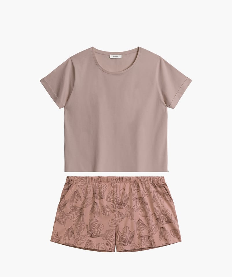 Piżama na wiosenno-letnie noce wykonana z miękkiej i przyjemnej w dotyku bawełny. Koszulka gładka z krótkim, podwiniętym rękawem i okrągłym dekoltem. Szorty z kwiatowym nadrukiem, kieszeniami po bokach, wykończone w talii szeroką gumą. Skład:100% bawełna.
