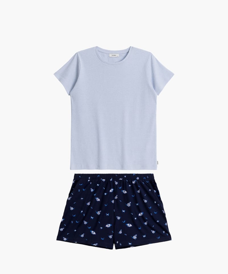 Piżama z miękkiej i przyjemnej w dotyku bawełny z dodatkiem wiskozy. Koszulka prążkowana z krótkim rękawem i okrągłym dekoltem. Szorty ozdobione motylami, z kieszeniami i miękką gumą w pasie. Skład: góra: 100% bawełna, dół: 60% bawełna, 40% poliester.