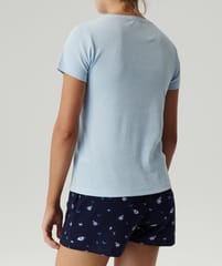 Piżama z miękkiej i przyjemnej w dotyku bawełny z dodatkiem wiskozy. Koszulka prążkowana z krótkim rękawem i okrągłym dekoltem. Szorty ozdobione motylami, z kieszeniami i miękką gumą w pasie. Skład: góra: 100% bawełna, dół: 60% bawełna, 40% poliester.
