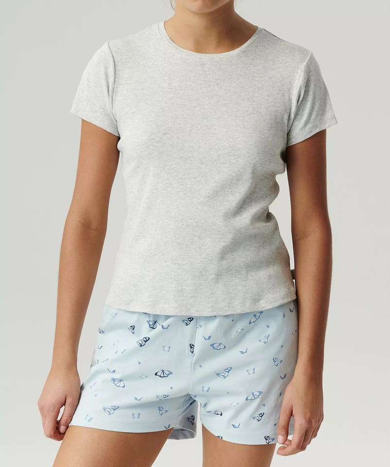 Piżama z miękkiej i przyjemnej w dotyku bawełny z dodatkiem wiskozy. Koszulka prążkowana z krótkim rękawem i okrągłym dekoltem. Szorty ozdobione motylami, z kieszeniami i miękką gumą w pasie. Skład: góra: 100% bawełna, dół: 60% bawełna, 40% poliester.
