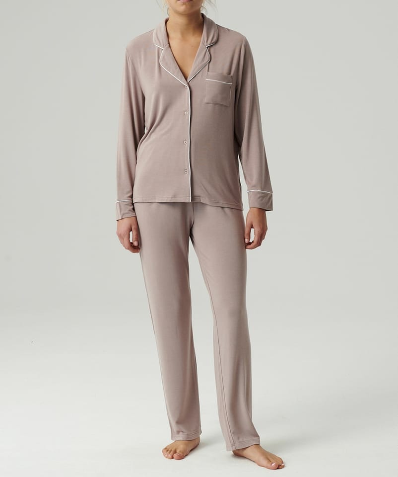 Piżama damska z lekkiego i delikatnie połyskującego modalu, niezwykle miękka, przewiewna oraz przyjemnie „chłodna” w dotyku i przyjazna dla ciała. Bluzka z długimi rękawami, zapinana na guziki, spodnie proste. Skład: 95% modal, 5% elastan.